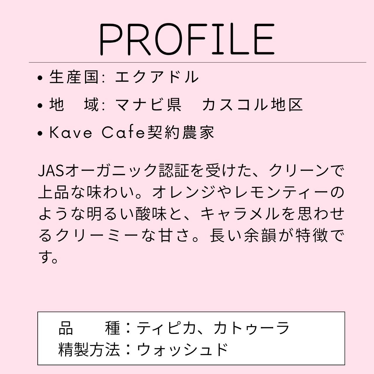 赤道直下、ガラパゴス諸島を擁する国、エクアドル。国の中央を南北にアンデス山脈が貫き、多様な自然環境が魅力の土地です。その太平洋側に位置するマナビ県は、標高は高くはないものの、良質のアラビカ種が作られる地域として知られています。1989年に設立されたKave Caféは、マナビ県でコーヒー栽培を営む小規模生産者からコーヒーチェリーを買い付け、自社で精選から輸出までを行っている団体。1991 年には有機認証を取得し、以来エクアドル産有機コーヒーの輸出を手掛けてきました。マナビ県の自然に寄り添った有機栽培で育てられ、1993年の初輸入以降、25年以上にわたって多くのお客様にご愛顧頂いて参りました。やわらかい甘みや、控えめながらしっかりと感じられる明るい酸味が特徴の、飲み飽きしない味わいのコーヒーです。